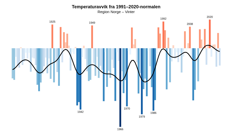 - Cuovddatmohkki (Karasjok, Finnmark) −18,3 grader (4,9 grader under normalen)