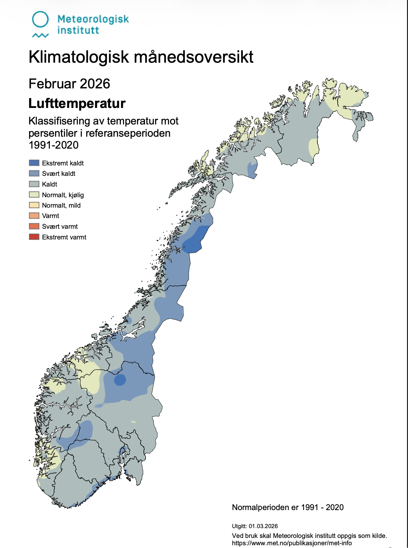 Det meste av landet var “Kald” eller “Svært kald” i februar. Noen mindre områder i Nordland og Innlandet var “Ekstremt kalde”. Det ble satt 17 rekorder for lav månedstemperatur og to rekorder for minimumstemperatur.