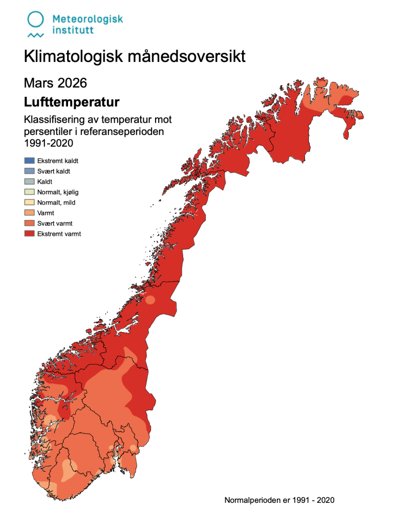 Landstemperaturen i mars endte 3,9 grader over det som er normalen i dagens klima. Den gamle rekorden er fra 2012. Da endte mars 3,3 grader over normalen.
