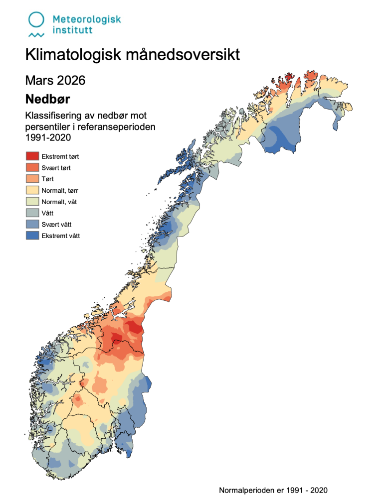 - “Ekstremt varmt/vått”: varmere/våtere enn det som er observert i hele normalperioden 1991-2020