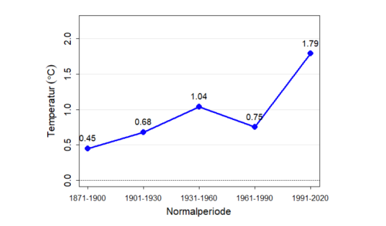 Rekonstruksjonen av normalperioden for 1871–1900 er basert på data fra 70 værstasjoner over hele Norge. Forskningen viser at den nasjonale gjennomsnittstemperaturen i denne perioden var 0,45 grader. I dag er gjennomsnittstemperaturen 1,79 grader.