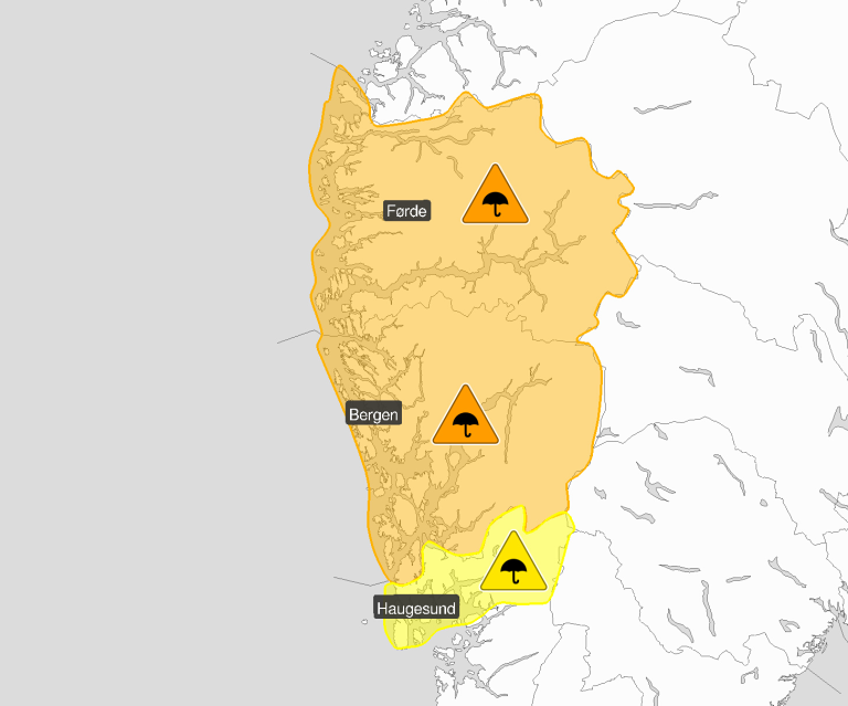 Avsluttet: Oransje farevarsel for styrtregn for deler av Vestlandet