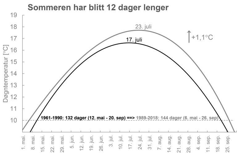 – Sommaren har altså blitt tolv dagar lenger, og gjennomsnittstemperaturen er 1,1 grader høgare når sommaren er på sitt varmaste. Varmetoppen kjem også i gjennomsnitt nokre dagar seinere enn før, seier Ketil Isaksen, klimaforskar ved Meteorologisk institutt.